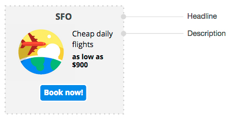 例如,您的广告版式可以采用如下安排:使用目的地名称“SFO”作为广告标题,使用航班说明“每日廉价航班”作为广告内容描述,使用航班价格“900 美元”作为价格。